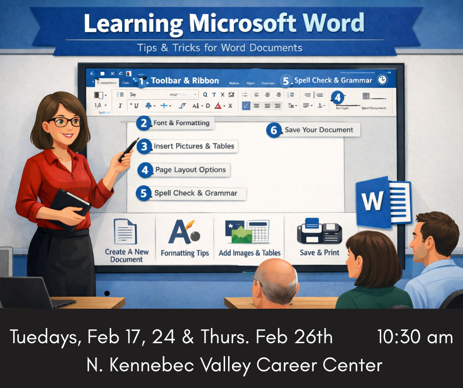 Join us in the free class at the Career Center in Hinckley to learn the basics of Microsoft Word, perfect for anyone getting back into the job force or going to school. 3 sessions-Tuesdays Feb 17 ad 26 and Thurs Feb 24th starting at 10:30 am. 1 hours class.