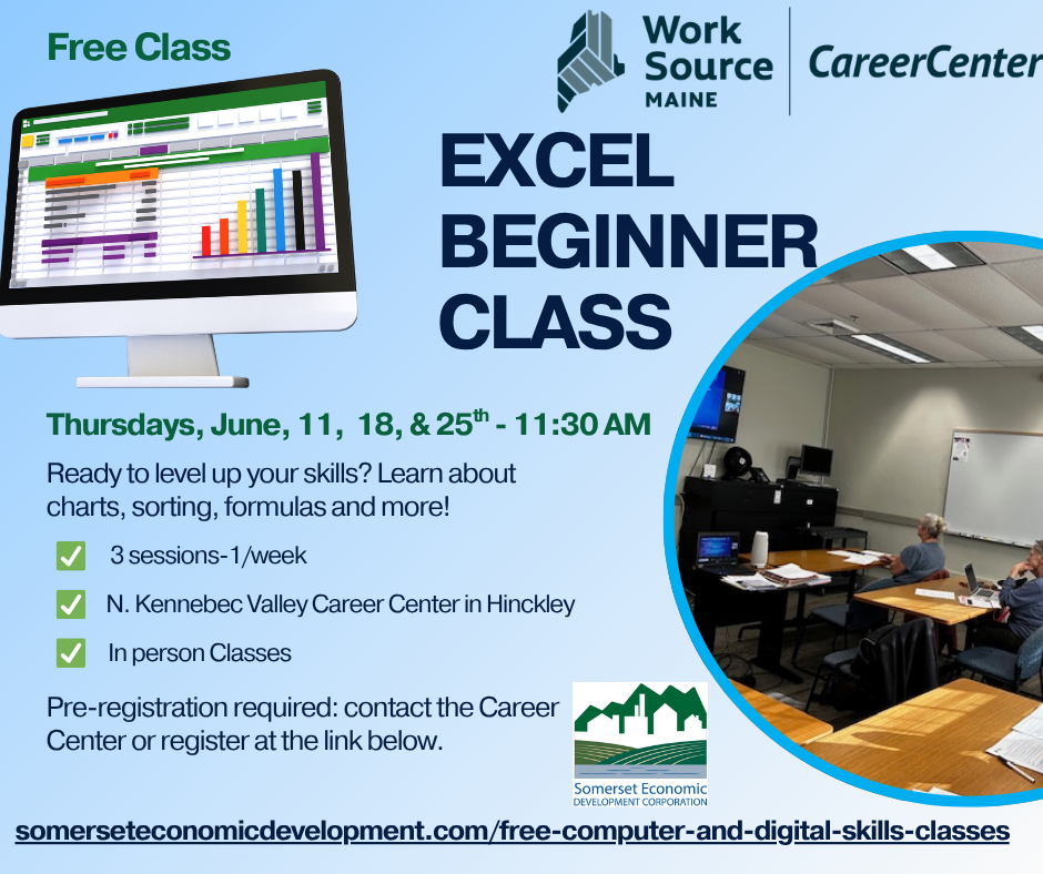 Join us in the free class learning how to use Microsoft’s Excel program for spreadsheets; learn the basics of creating a spreadsheet, terminology, tools and some basic functions. The class is held at the N. Kennebec Valley Career Center in Hinckley. 3 sessions-Thursdays, June 11, 18, and 21st starting at 11:30 am. 1 hours class.