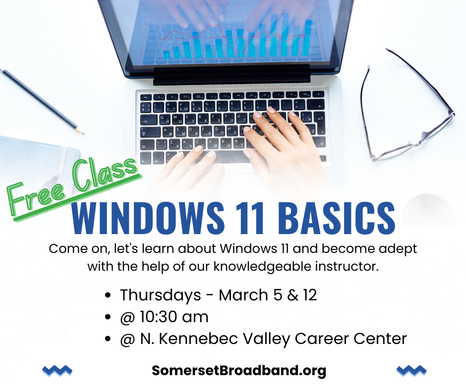 Join us in the free class at the Career Center in Hinckley to learn the basics of using Windows 11 operating system. Setting passwords, users, passkeys, learn about settings, updating and organizing and customizing your computer. 2 sessions- Thursdays, March 5 & 12th starting at 10:30 am. 1 hour class.