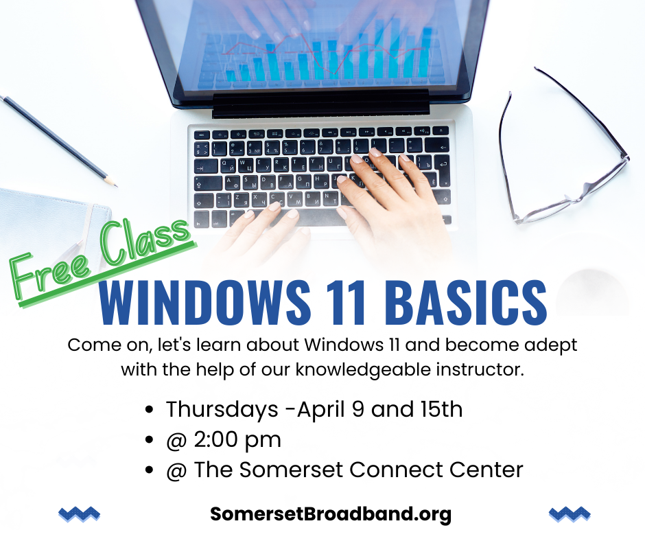 Join us in the free class at the Somerset Connect Center to learn the basics of using Windows 11 operating system. Setting passwords, users, passkeys, learn about settings, updating and organizing and customizing your computer. 2 sessions- Thursdays, April 9 and 16th starting at 2:00 pm. 1 hour class. Bring your own laptop or you may learn on one of ours